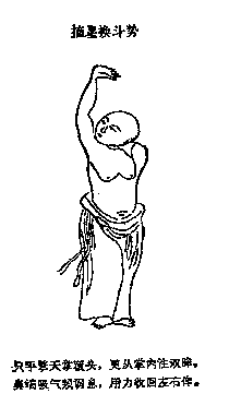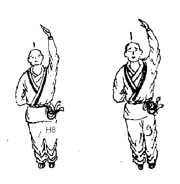 1.1. Chỉ thủ kích thiên (bàn tay chỉ trời) : tiếp theo thức trên, chưởng phải di chuyển tới vị trí ngang lưng, úp bàn tay vào sống ngang lưng (huyệt Lao-cung áp vào huyệt Mệnh-môn). Đồng thời tay trái đưa lên cao, chưởng mở rộng hướng sang phải . Lưỡi từ từ nâng cao. Mắt nhìn vào tay. (H8). Thức này phải buông lỏng cần cổ, dẫn khí từ não (huyệt Bách-hội) theo xương sống (Đốc-mạch tới huyệt Mệnh-môn).
