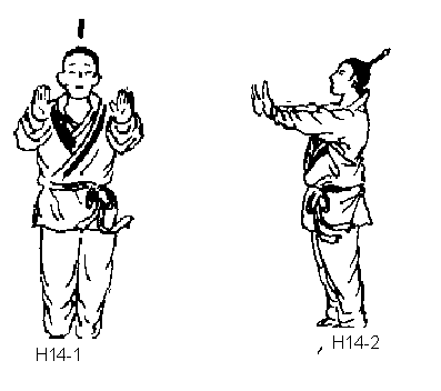 1.2. Lưỡng chưởng tiền thôi (đẩy hai chưởng về trước), tiếp theo thức trên, hai tay do quyền biến chưởng, từ từ đẩy về trước, chưởng tâm hướng về trước. Hai cánh tay thẳng ngang với vai. Hai mắt nhìn về trước. (H14).
