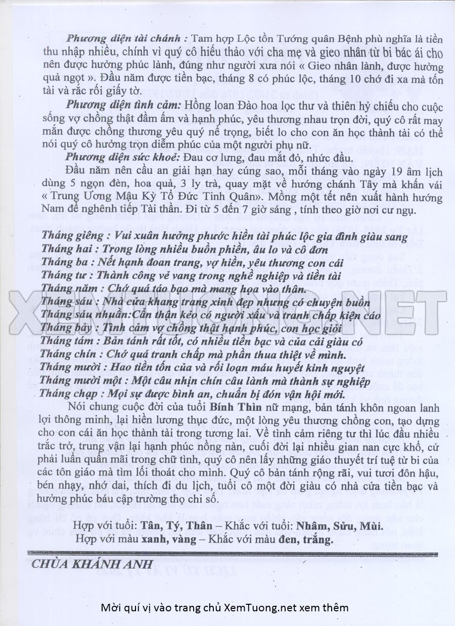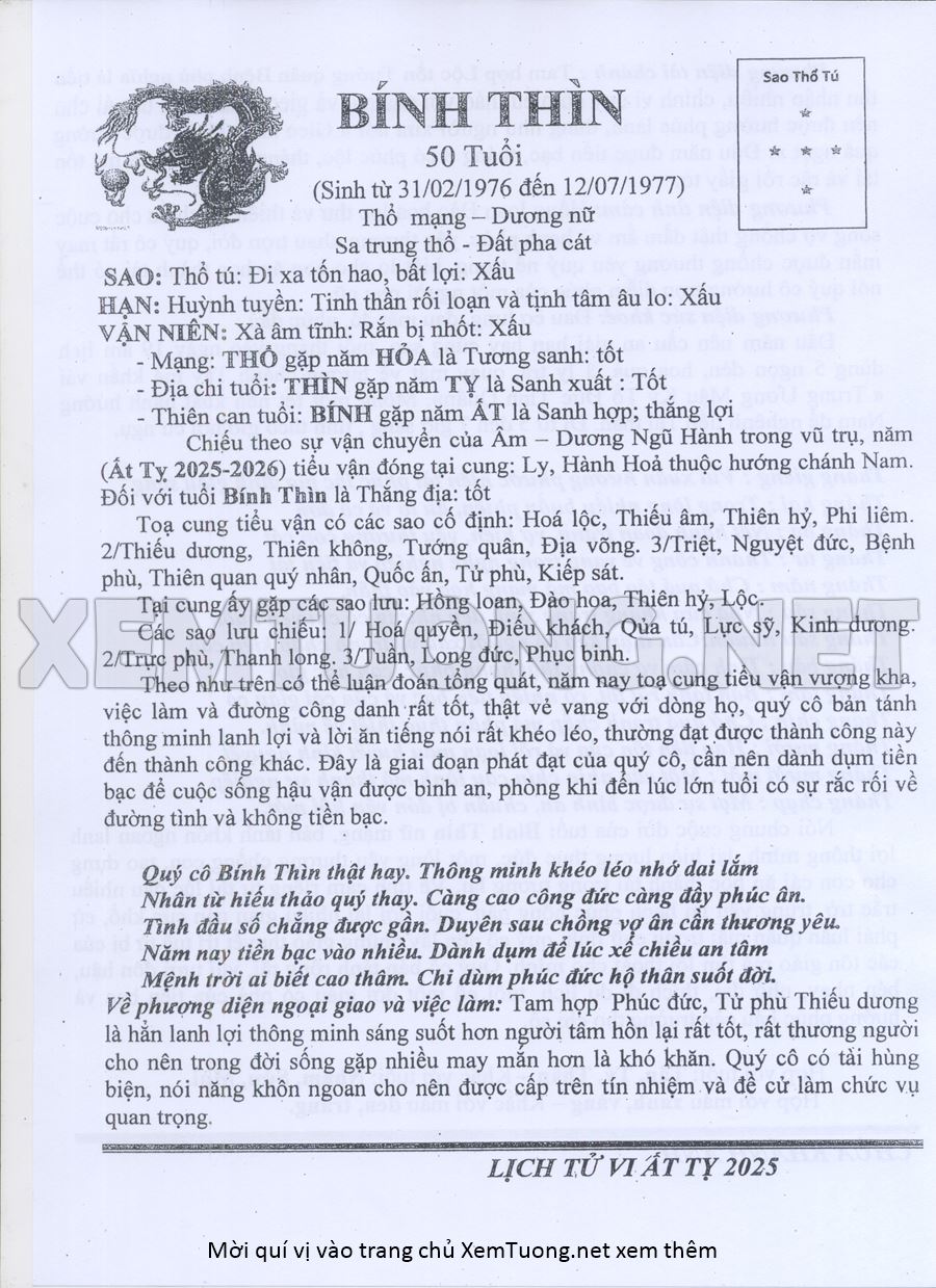 Tử Vi Năm Ất Tỵ 2025 mạng nữ BÍNH THÌN