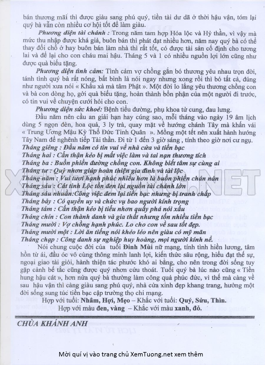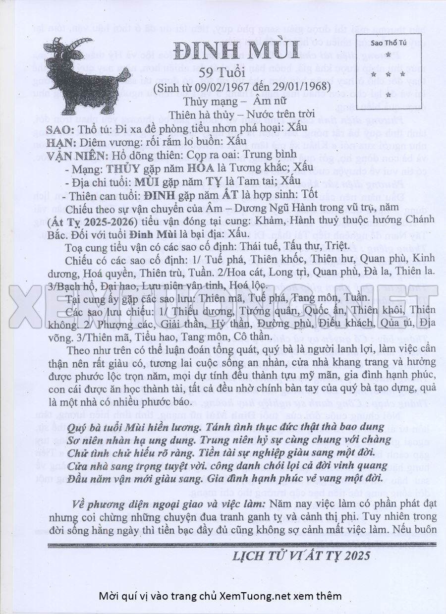 Tử Vi Năm Ất Tỵ 2025 mạng nữ Đinh MÙI