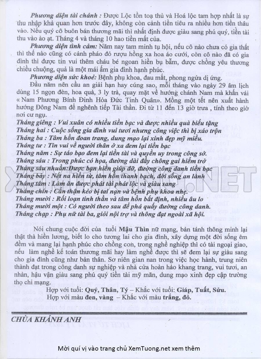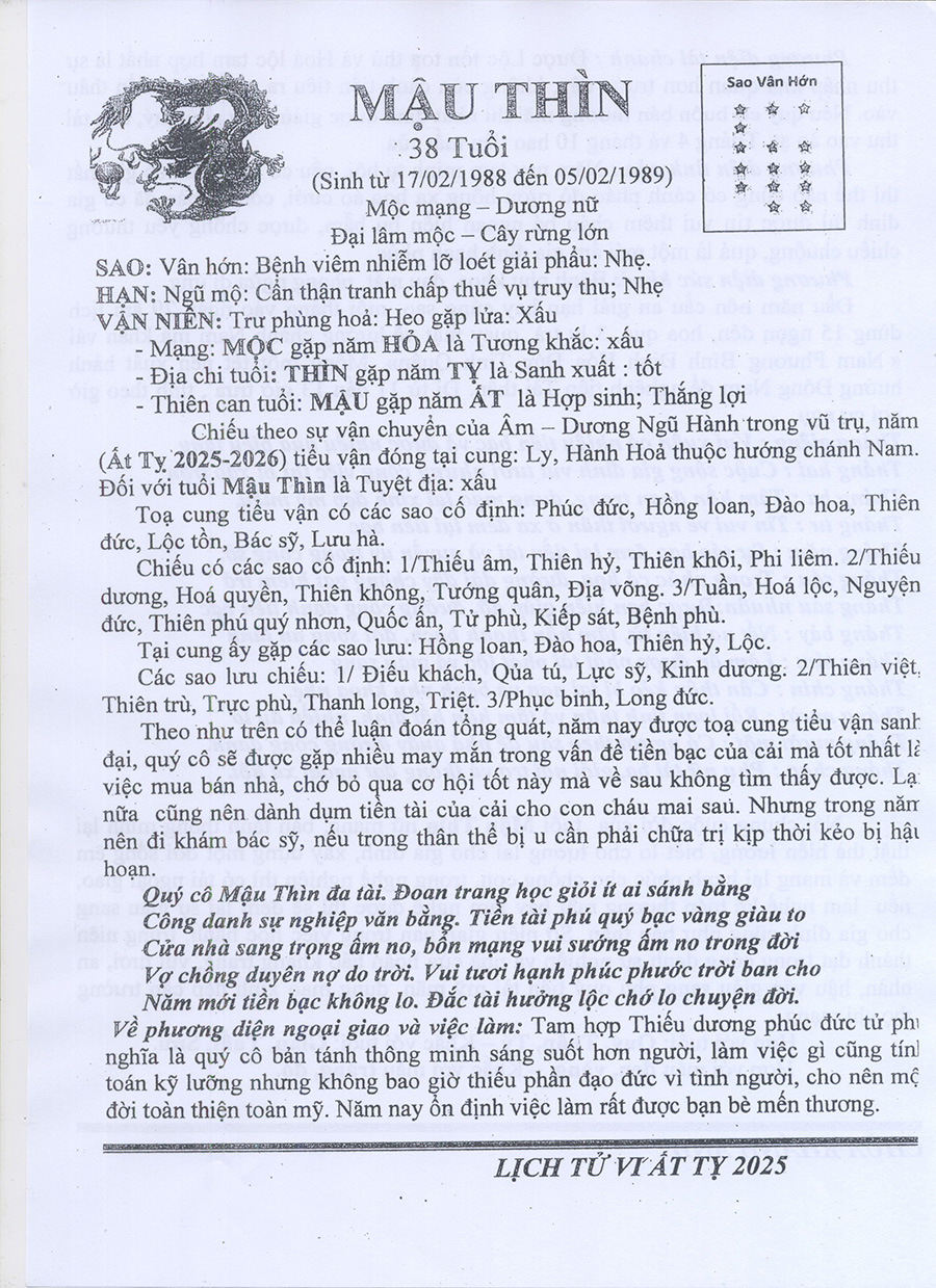 Tử Vi Năm Ất Tỵ 2025 mạng nữ MẬU THÌN