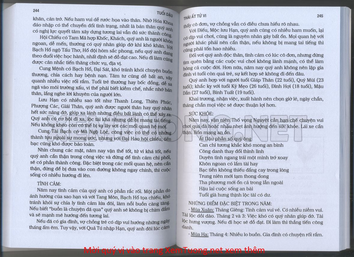 (Lưu ý: Thái Ất Tử Vi được chúng tôi scan từ sách, do đó mỗi tuổi sẽ có nhiều trang, quý vị xem xong hãy nhấn vào trang tiếp theo để xem hết phần tuổi muốn xem. Nếu quý vị xem bằng điện thoại thì hãy kéo qua lại để xem phần bị khuất.)