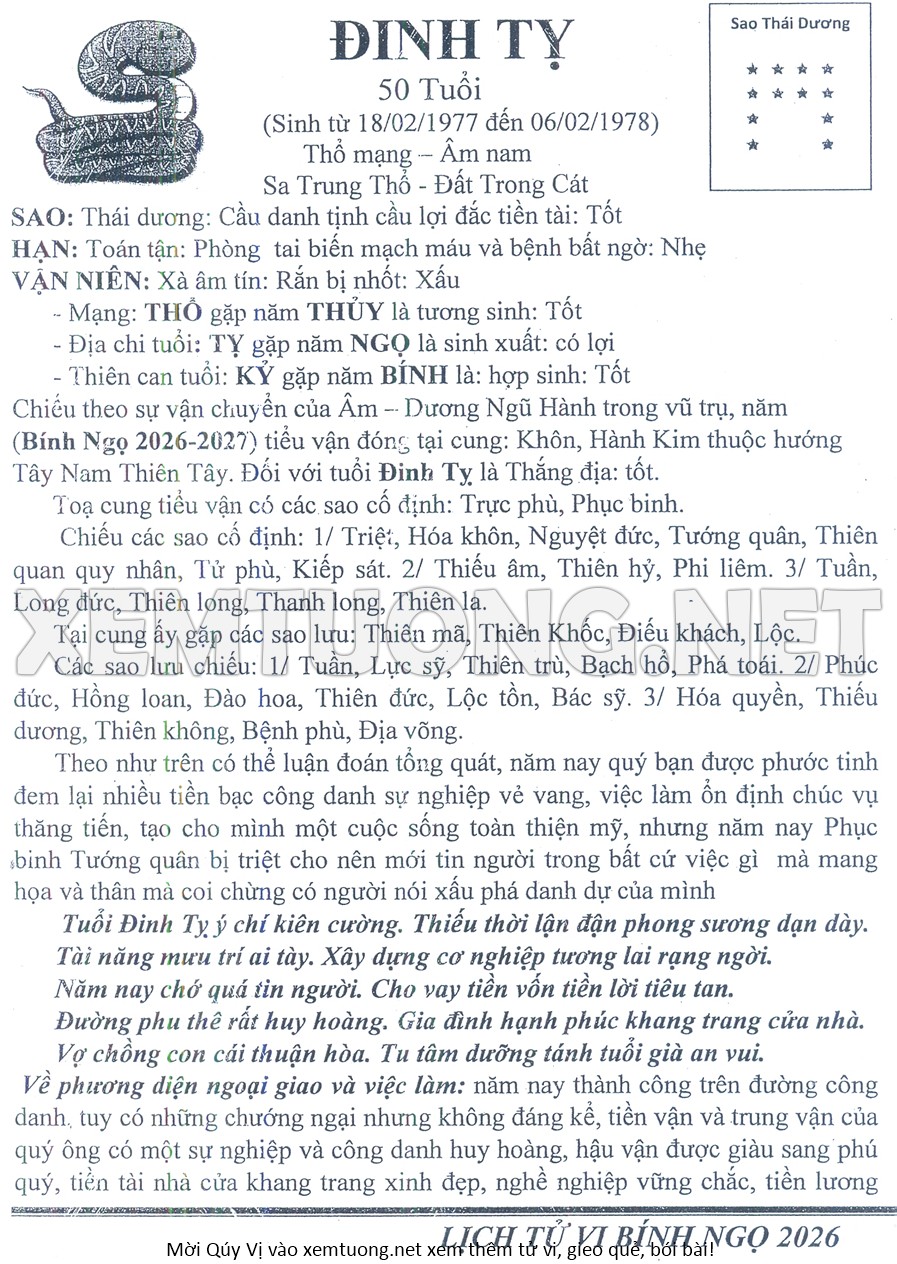 Tử Vi Năm Bính Ngọ 2026 mạng nam ĐINH TỴ