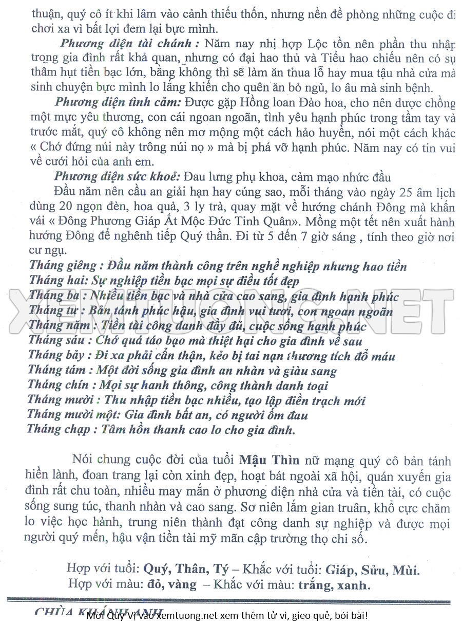 Tử Vi Năm Bính Ngọ 2026 mạng nữ MẬU THÌN