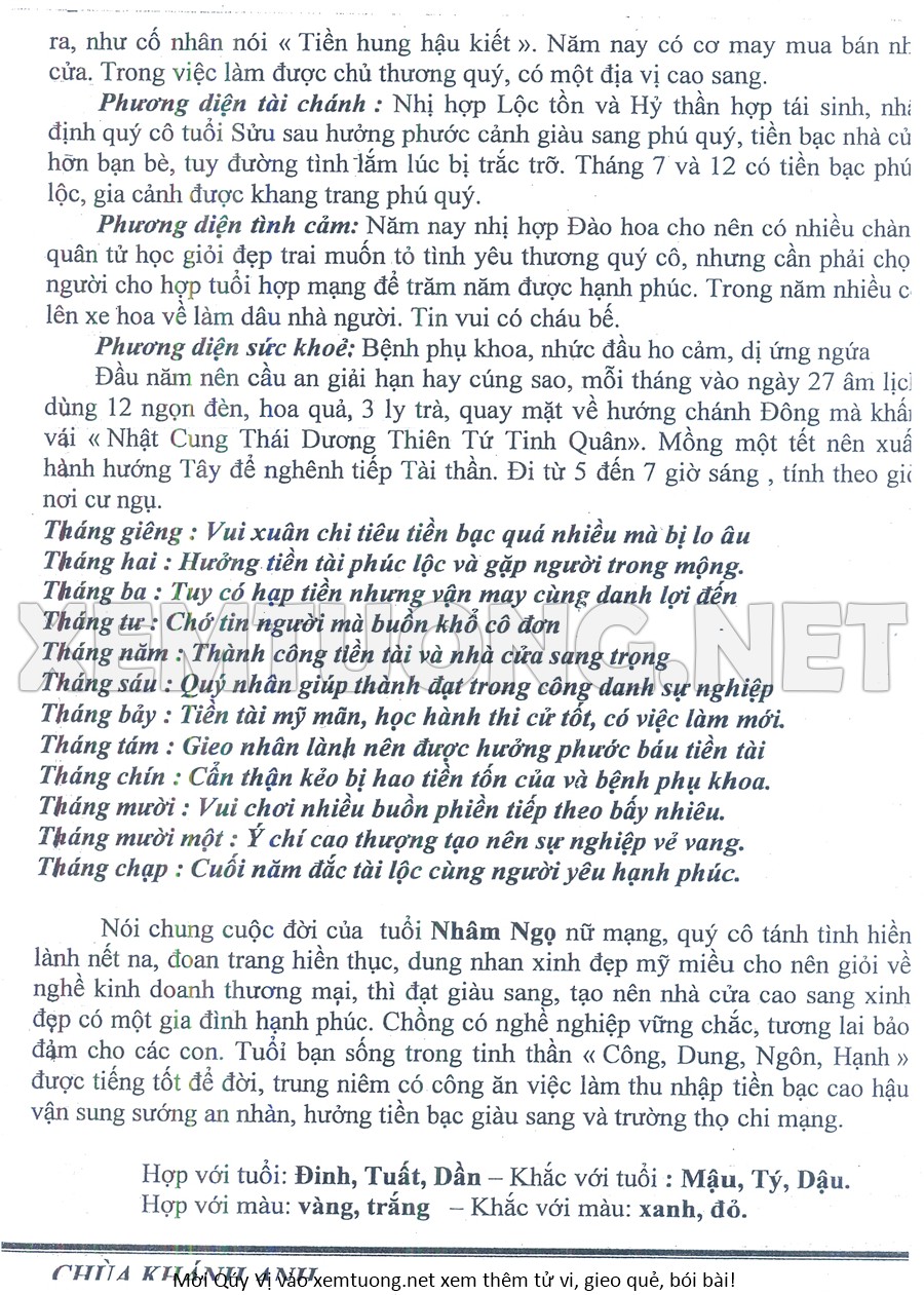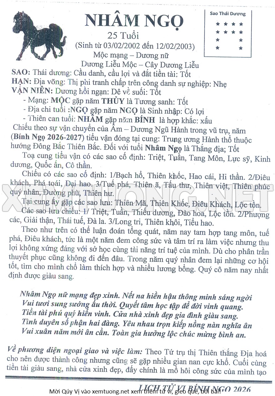 Tử Vi Năm Bính Ngọ 2026 mạng nữ NHÂM NGỌ
