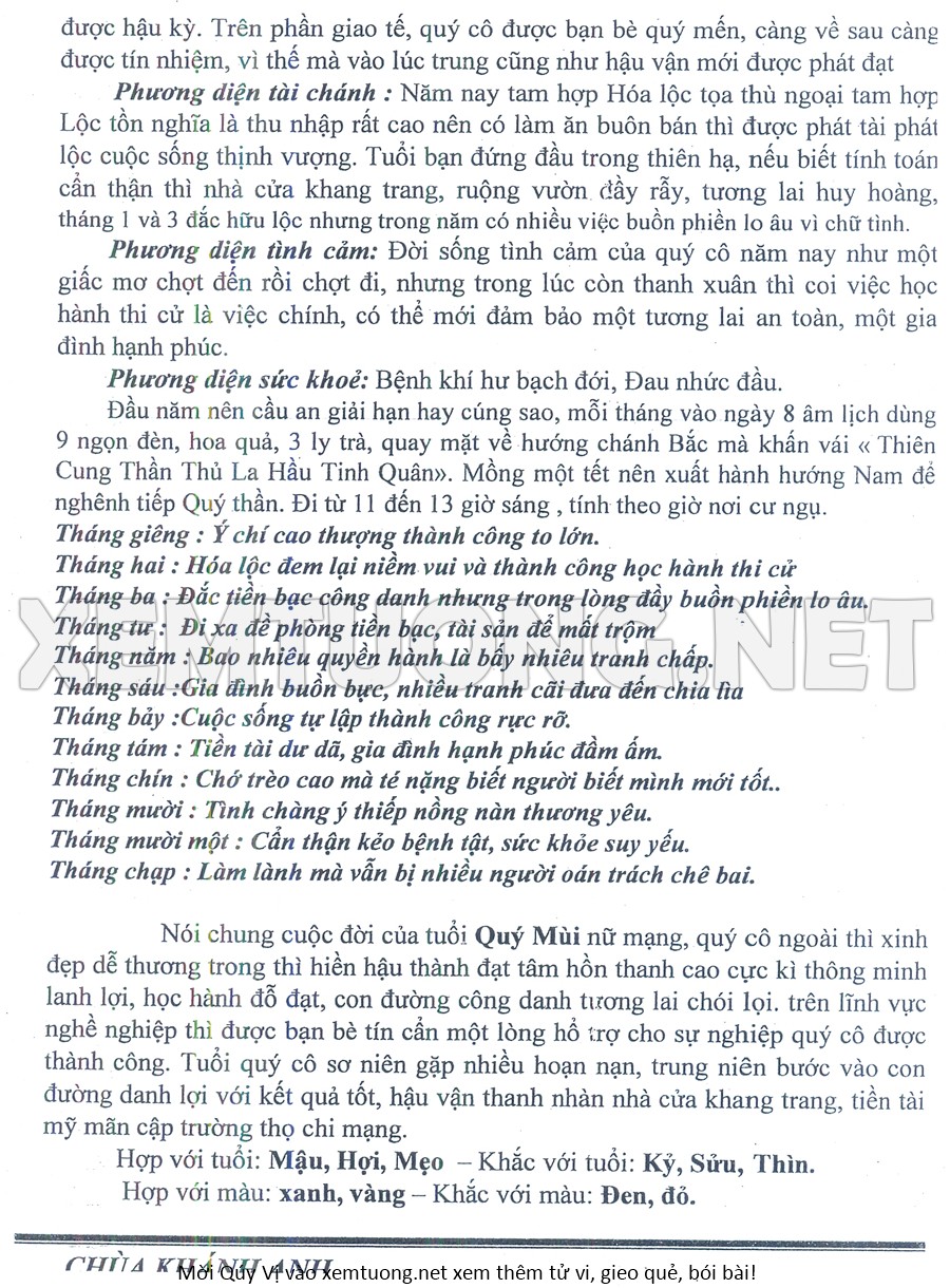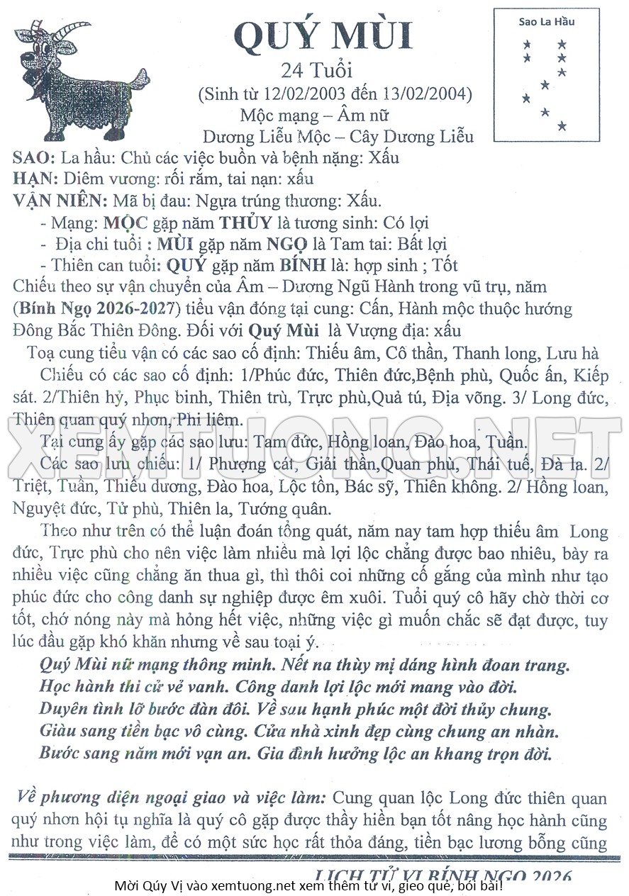 Tử Vi Năm Bính Ngọ 2026 mạng nữ Qúy Mùi