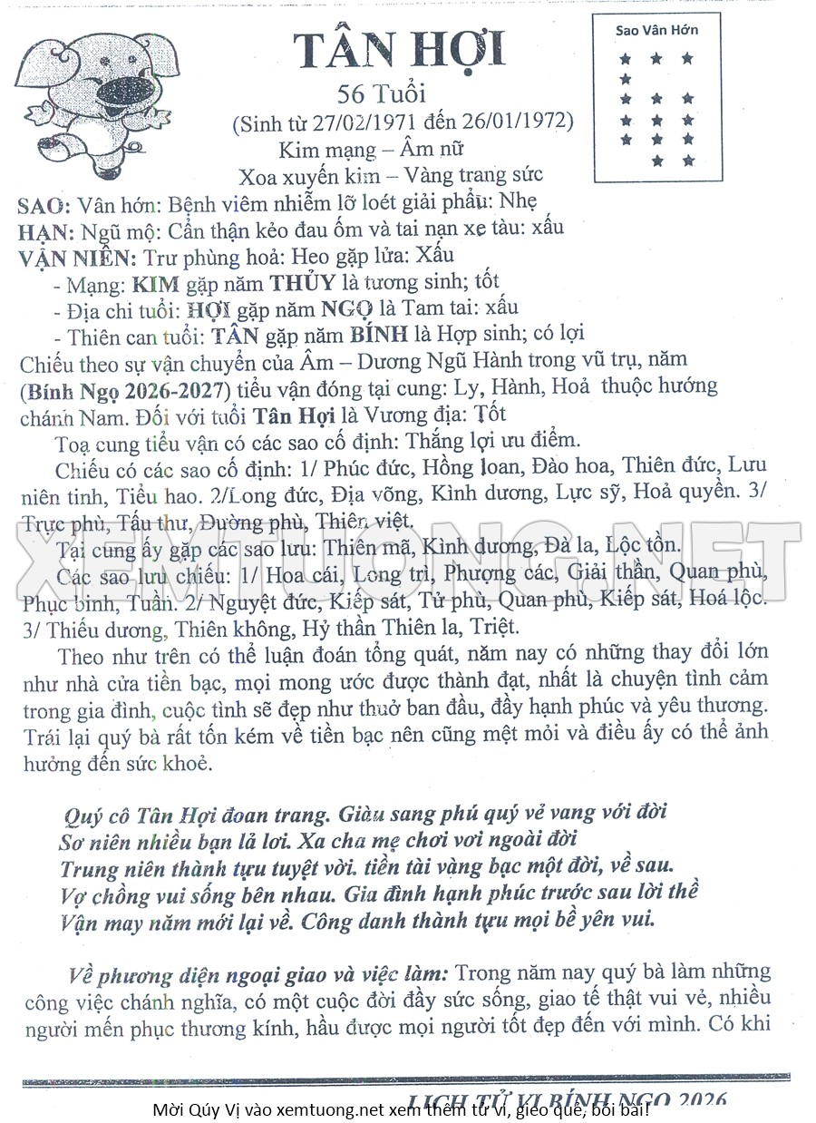 Tử Vi Năm Bính Ngọ 2026 mạng nữ TÂN HỢI